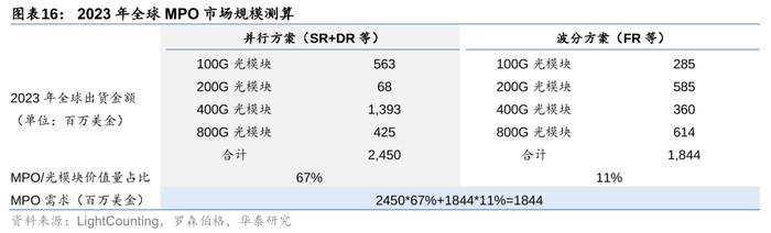 定量测算:2023年全球MPO市场空间约18亿美金。布线解决方案厂商罗森伯格(未上市)曾梳理过数据中心光模块在进行结构化布线组网的条件下,不同传输方案的光模块与布线成本的配比。根据其结论,以某400G数通光模块组网的典型场景为例,当采用400G CWDM方案时(即波分,如400G FR4等),光模块在总成本中的占比约90%,光纤连接器成本占比约10%,即光纤连接器的采购金额约为光模块的11%;当采用400G PSM方案时(即并行,如400G DR4等),光模块在总成本中的占比约60%,光纤连接器成本占比约40%,即光纤连接器的采购金额约为光模块的67%。我们以该典型场景为假设,结合LightCounting发布的2023年全球100G~800G数通光模块出货金额(未考虑40G及以下低价值量型号),测算全球MPO市场规模约18.4亿美金,约占数通光模块出货金额的43%。