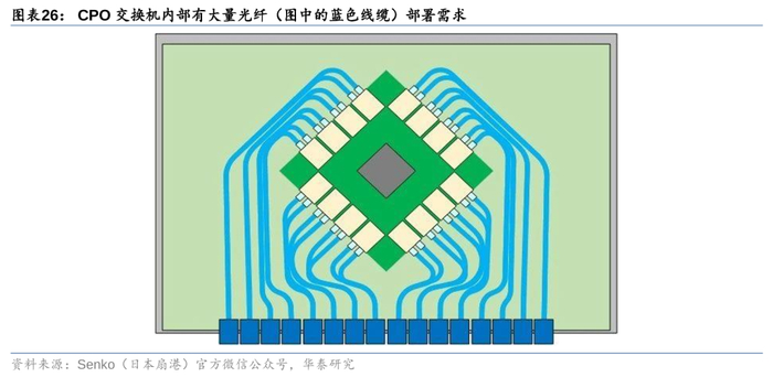 CPO交换机内部预计带来大量光纤部署需求。常规交换机内部以电信号传输为主,故交换机内部无光纤部署的需要;而CPO交换机内部由于有光信号的传输,所以CPO方案虽然拉近了光引擎和交换ASIC之间的距离,但也额外增加了光引擎到交换机机箱前面板的布线。以51.2T CPO为例,根据Senko(日本扇港)方案,在交换ASIC周围共部署16个光引擎,每个光引擎含有32个通道,单通道速率为100G,共实现51.2T的总速率。使用完全并行的光纤方案时,每个通道均需要2根光纤(1收+1发),故单台CPO内部共需要1024根光纤。
