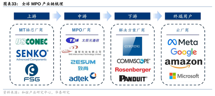 MPO产业链:MT插芯→MPO→整体解决方案。单芯光纤连接器多应用于电信市场,其产业链主要包括上游的陶瓷插芯、中游的单芯光纤连接器以及下游用户(电信运营商、ICT设备商)。而MPO连接器多应用于数据中心市场,其产业链主要环节包括上游的MT插芯(区别于陶瓷插芯)、中游的MPO连接器、下游的总体解决/布线方案,以及最终用户(如云厂商、互联网厂商)。