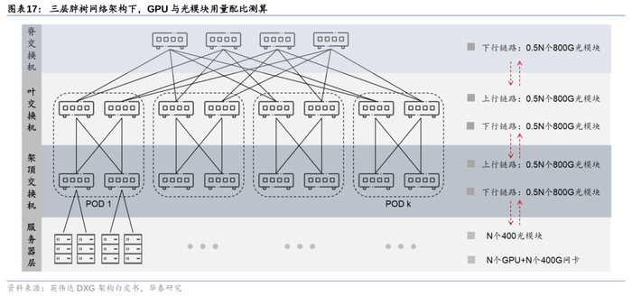 大规模GPU集群催生大量高速光模块需求。根据我们于2024年2月19日发布的报告《光模块:时代的跨越,从云计算迈向AI》,在AI时代的数据中心中,云厂商通过如下方式提升GPU集群节点间的通信带宽:1)提升端口吞吐量,如英伟达在DGX H100服务器中采用了CX-7网卡,速率达到了400G,较此前云厂商的通用服务器所主流使用的50G、100G网卡有较大升级,并配套引入了800G端口交换机、800G光模块等;在B系列GPU侧有望引入CX-8网卡,进一步带动1.6T光模块的需求释放;2)优化组网架构,如英伟达的AI训练网络采用了胖树架构,相较于叶脊架构有更小了阻塞比,根据我们在报告中的测算,在三层胖树架构下,H100的需求量与800G光模块的用量呈1:2.5的线性相关关系,相比云数据中心传统三层网络架构下CPU与光模块约1:0.55的配比有明显提升。