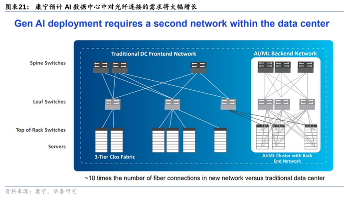 AI数据中心带宽密度快速提升,光纤连接需求有望显著增长。根据全球光纤龙头供应商康宁于2024年7月业绩会中的观点,传统的数据中心主要为互连的交换机和CPU组成的互联集群;而AI数据中心则需要第二张网络,即后端网络,来将GPU连接为一个集群。而相比于CPU,GPU的算力更为强大,故需要用到更高的带宽进行卡间互联,康宁预计与传统数据中心相比,GPU集群中的光纤连接需求量近似前者的10倍(康宁举例,典型的单机架CPU共需要32根光纤,而单GPU机架则需要256根)。康宁表示以目前合作的项目来看,光纤连接的价值量约合单GPU小几百美金。另一方面,康宁认为生成式AI的发展有望带来数据中心互联需求的提升,也有望额外带动光纤连接用量的增长。康宁表示已与Lumen公司达成合作协议,未来两年均将为Lumen预留其全球光纤产能的10%,以供应Lumen在AI领域的业务需求。