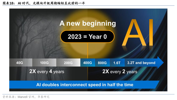 AI时代,光模块迭代周期预计显著缩短。我们认为在AI时代,随着GPU产品迭代周期的缩短,光模块速率的升级周期预计提速。2024年3月召开的美国光博会(OFC 2024)期间,Lumentum(LITE US)也表示随着AI时代的到来,光通信的角色从此前的“连接”变为了“计算的一部分”,这使得光模块的升级周期从云计算时代的4~5年缩短至AI时代的2年。例如随着英伟达Blackwell GPU平台的发布,光模块从800G迈向1.6T仅历时2年,扭转了此前云计算时代升级周期放慢的趋势。
