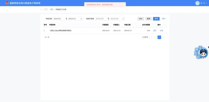 第三步、纳税人从查询结果列表中,通过“操作”列提供【更正】、【作废】完成对应申报表单的相关操作。