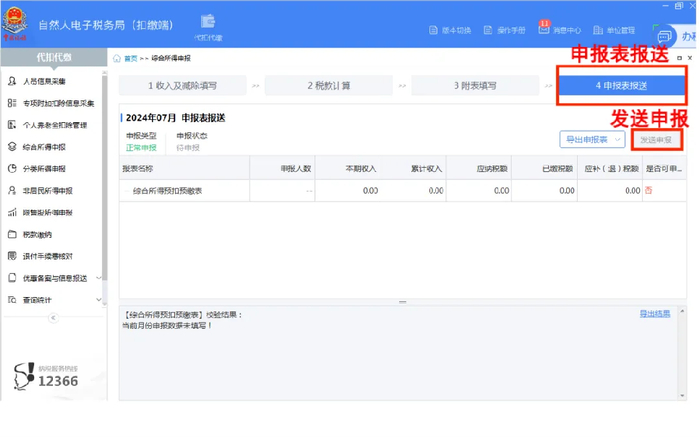 第五步:点击进入【申报表报送】模块,核实申报表报送数据,确认无误后,点击【发送申报】。如需缴纳税款,可点击左侧【税款缴纳】模块进行缴税。