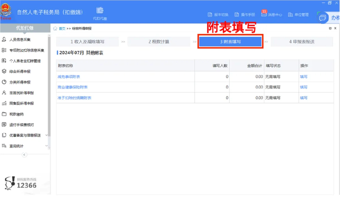 第四步:点击进入【附表填写】模块,查看是否有需要填写的《减免事项附表》《商业健康保险附表》《准予扣除的捐赠附表》,若不涉及,则无需填写。
