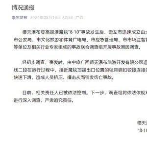 中共崇左市委宣传部微信公众号“崇左发布”13日晚间发布情况通报称,德天瀑布登高观瀑魔毯“8·10”事故发生后,崇左市迅速成立由大新县人民政府和市公安局、市文化旅游和体育广电局、市应急管理局、市市场监督管理局、市总工会等单位及相关行业专家组成的事故联合调查组开展事故原因调查。