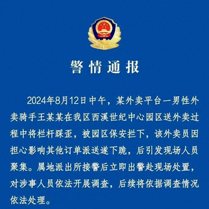 8月12日,杭州西溪世纪中心物业保安与外卖骑手冲突一事引发关注。当天晚间,杭州市公安局西湖分局发布警情通报表示,某外卖平台男性外卖骑手将小区栏杆踩歪后,被园区保安拦下,外卖员因担心影响其他订单派送遂下跪,后引发现场人员聚集。警方已对涉事人员依法开展调查,后续还将依据调查情况依法处理。