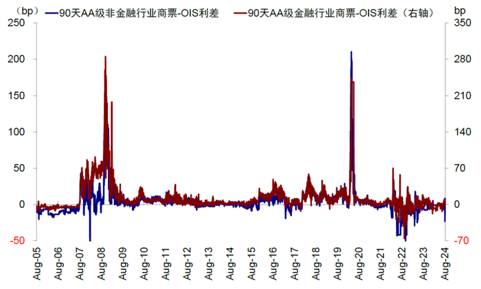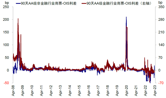 ► 金融体系流动性指标:金融体系流动性,这一环节相较来说更加受到市场关注,具体指标有:1)OIS-SOFR利差:OIS利率(Overnight Interest Swap, OIS)指隔夜利率互换合约中的固定利率,SOFR利率(Secured Overnight Financing Rate)是衡量在回购协议(repo)市场中以美国国债为抵押借款的隔夜现金成本的广泛指标,作为LIBOR(伦敦银行间拆借利率)的替代使用。在OIS-SOFR掉期中,一方同意按固定利率支付现金流,另一方则按SOFR的浮动利率支付现金流,利差的扩大通常表明银行间的信用风险增加和流动性收紧,市场对未来流动性的担忧增强;2)回购市场:是包括货币市场基金、银行等资金出借方向一些集合性投资产品如对冲基金等资金借入方提供流动性、实现短期融资的主要市场,特别是对冲基金通常利用回购市场来实现加杠杆的目的。如疫情期间,由于部分金融资产的大跌和金融市场流动性紧张,回购市场一度受到明显扰动,资金出借意愿大幅降低。3)商票利差:商业票据通常为信用良好的金融或非金融企业发行,通常期限较短,由于货币市场基金是商业票据的主要投资者,因此商票利差的变化也一定程度上反映了短期货币市场的流动性。
