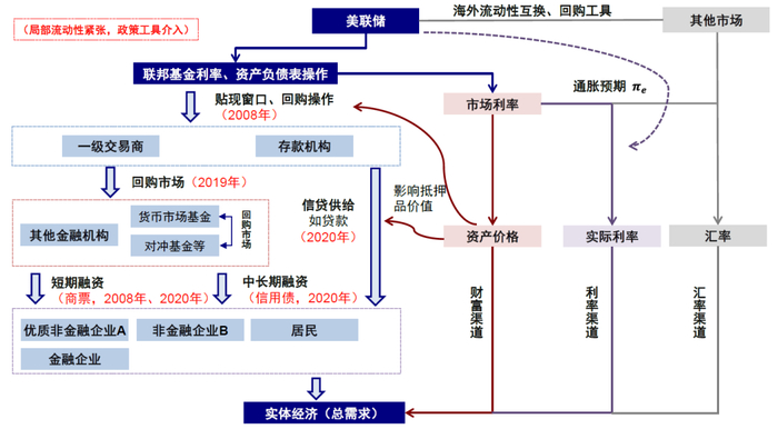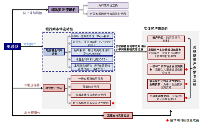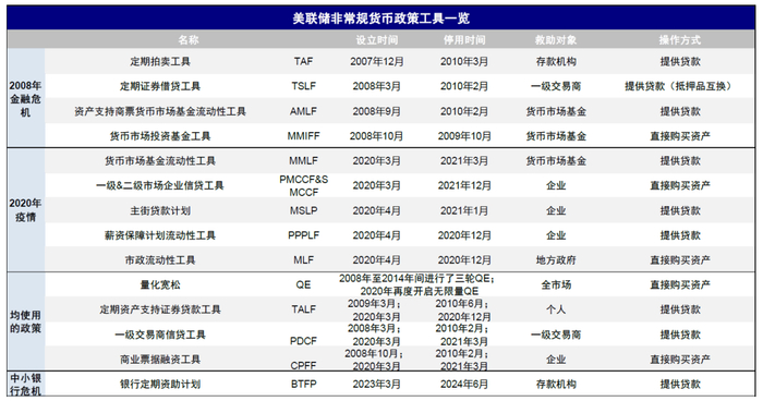 在传统的信贷传导渠道下,美联储作为流动性的调节主体,通过公开市场操作调控市场利率和货币供给,从而影响商业银行等中介机构向实体经济扩张信贷的能力。但风险事件发生后,局部环节的流动性不足使得美联储需要“对症下药”,定点的投放流动性。常规操作(加息或降息)自不必说,本文中我们将重点聚焦非常规的政策工具,即如何操作与对谁操作?