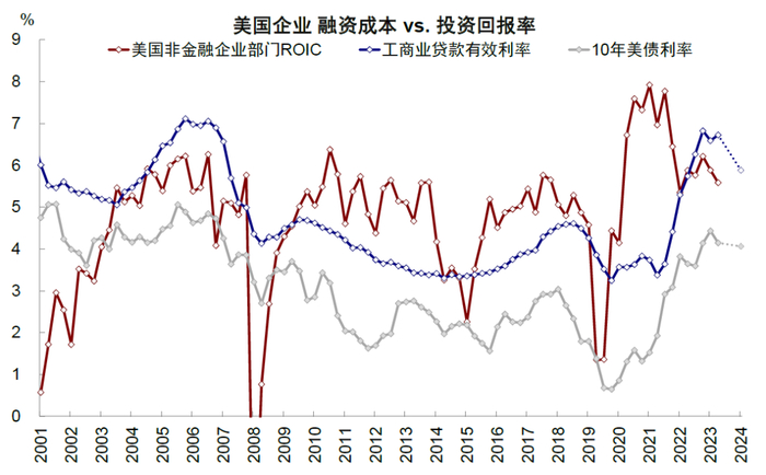 首先,从现金流量表看,近期日元套息交易逆转更多停留在局部流动性冲击,全局性的美元流动性紧张并未出现(往往体现为美元走强、OIS和商票利差走高、汇率交叉互换走阔,导致资产被“无差别”抛售,包括黄金与美债,典型如2020年疫情期间)。其次,从资产负债表看,得益于政府加杠杆帮助居民去杠杆,美国私人部门资产负债表也相对健康,明显低于2008年金融危机水平,也是当前并不面临系统性风险的核心原因。第三,从利润表看,美国增长放缓,但并不面临深度衰退压力,得益于更高的投资回报率可以承受更高利率,以及不同环节错位提供的对冲效果,因此可以靠小幅降息解决当前问题,即便出现类似于2023年硅谷银行的冲击,美联储也有充足应对手段,迅速向薄弱环节提供流动性以平息市场的波动和阻断危机进一步蔓延的可能。