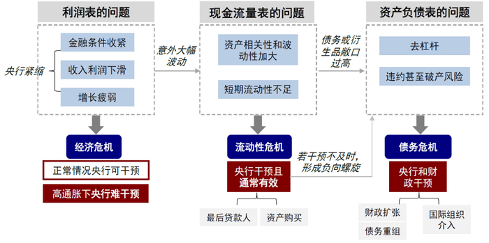 回顾历史经验看,增长压力、流动性冲击和债务危机是一个经济周期中可能遇到的不同“麻烦”,这又分别对应我们熟悉的企业三张表中的利润表、现金流量表(融资现金流和投资现金流)和资产负债表的问题;利润表体现需求的强弱、现金流量表刻画获取资金的难易、资产负债表则展现偿付能力和杠杆水平,极端情形下分别对应衰退、流动性挤兑与债务危机,具体来看: