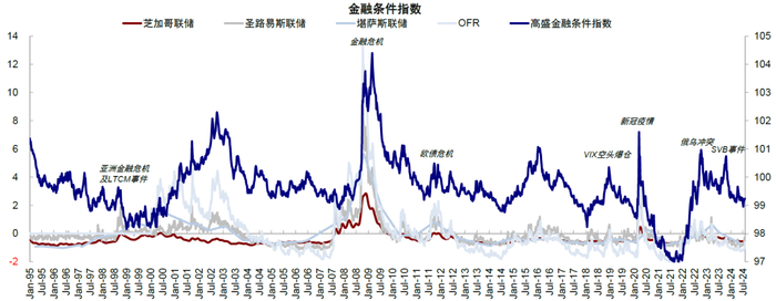 衡量美国金融市场流动性可以从央行投放、金融系统、资本市场、企业部门和离岸市场等五个维度着手,刻画上文中提到货币传导路径中不同层级的流动性情况,具体来看:1)央行金融流动性指标(美联储负债-TGA-逆回购,近似等于商业银行准备金规模),从“量”的角度衡量美联储和财政对金融体系流动性的影响,这一指标对美股中期走势也有较好的预测效果;2)OIS-SOFR利差,表征美国银行体系之间的流动性紧张程度;3)投资级和高收益级信用利差,金融与非金融商票利差,都可以衡量企业融资成本;4)美股VIX和美债MOVE指标衡量资产价格波动;5)主要汇率与美元的交叉互换,刻画离岸美元的紧张程度。我们在图表26梳理了上述五个维度的13个指标,供投资者参考。