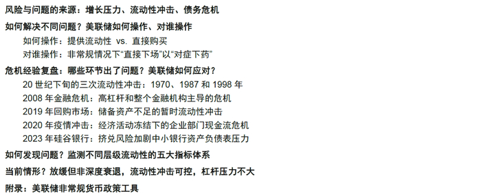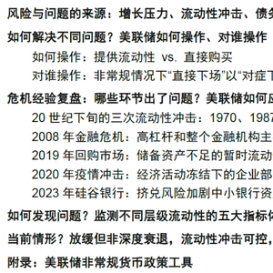 本文中,我们通过分析风险的来源、梳理历次美联储应对危机的方式、不同政策工具箱,以及如何监测风险这四个方面,未雨绸缪来讨论美联储在应对未来可能波动中(如衰退风险,流动性冲击,又或信用问题)的对策与有效性。
