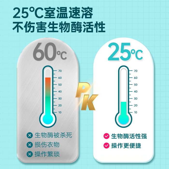 所以用常温水就能溶解,这样还能保留生物酶活性,洗出来的衣物更干净柔软!