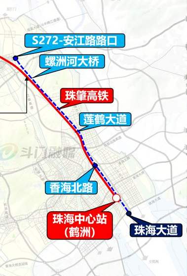 莲鹤大道项目位于斗门区东北部,沿珠肇高铁走廊布局,起点位于安江路-S272路口,终点位于香海北路