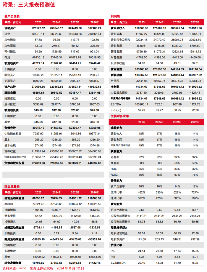 盈利能力稳定,现金流表现优异。1)盈利端:2024H1毛利率为91.76%(同比-0.04pct),销售净利率52.70%(同比-0.96pct),其中Q2毛利率为90.68%(同比-0.12pct)。净利率为50.60%(同比-0.89pct)。2)费用端:2024H1期间费用率为6.90%(同比-0.03pct),其中销售费率3.14%(同比+0.62pct),管理费率4.60%(同比-0.80pct)。3)现金流:2024H1合同负债99.93亿元(同比+36.25%),高于收入增速,预计为6月底部分经销商提前进行三季度回款;销售收现为870.94亿元(同比+26.09%),经营活动现金流量净额366.22亿元(同比+20.52%)。