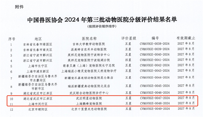 近日,中国兽医协会公布了2024年第三批动物医院分级评价结果,新瑞鹏宠物医疗集团(下称“新瑞鹏集团”)旗下两家宠物医院入选,分别为武汉明星动物医院和上海鹏峰宠物医院,充分体现出中国兽医协会对两家医院在医疗设施,医院环境、医疗技术水平、医疗服务质量、医院管理等多方面的高度认可。