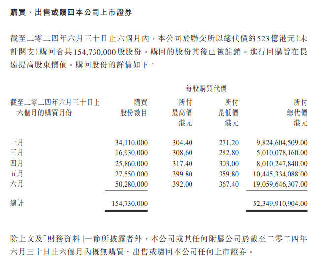腾讯控股公告,截至2024年6月30日止六个月内,公司于联交所以总代价约523亿港元(未计开支)购回合共154730000股股份。购回的股份其后已被注销。进行回购旨在长远提高股东价值。