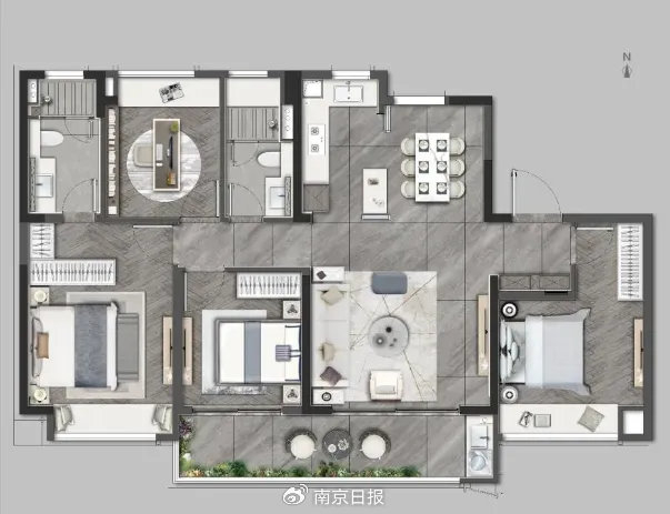 主卧采用酒店式套房设计,配备有独立卫浴,保障了私密感。南北侧卧均有飘窗,增加了空间的实用性和功能性。