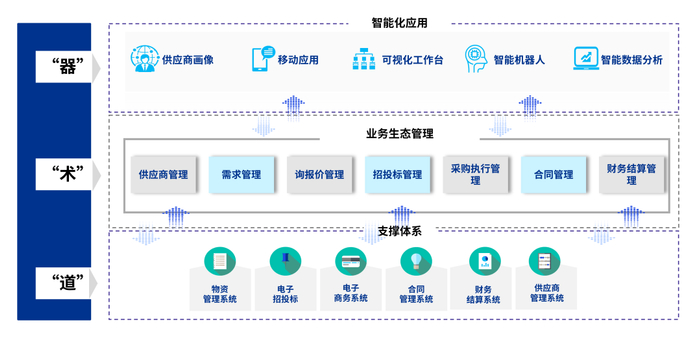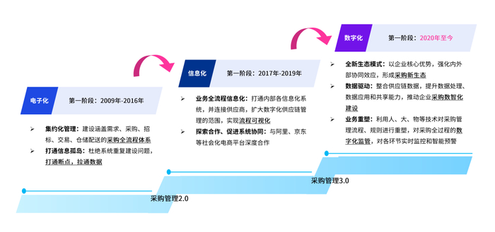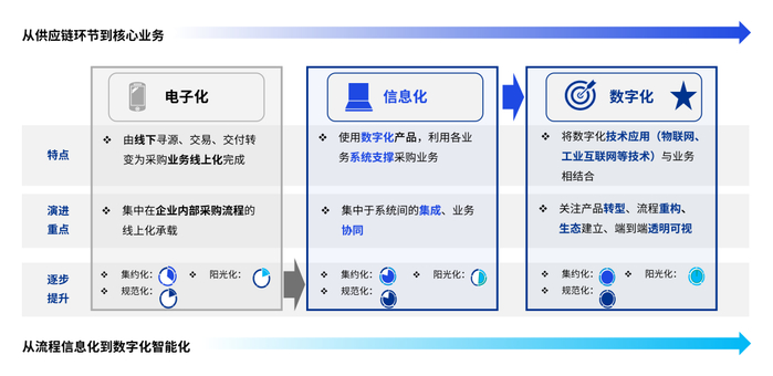 数字化阶段:结合数字化手段与技术全面赋能业务,关注产品、服务的转型升级,流程重构及生态建立,达到采购业务全流程集约化、规范化、阳光化;