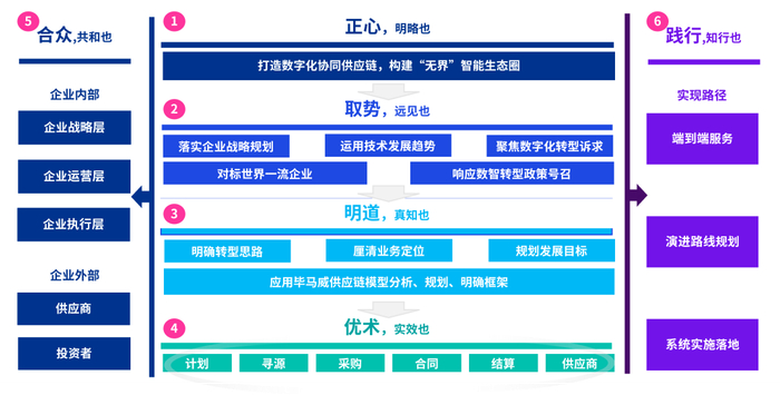 有方法:毕马威服务客户的长期实践中,形成了一套方法论;以“正心、取势、明道、优术、合众、践行”六大主题,协助客户达到数字化采购的目标。