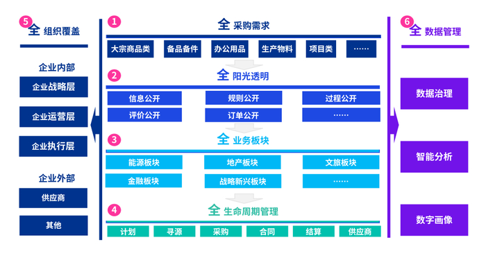 全业务板块:在面向多业务板块并存发展的大型企业时,采购管理体系应满足所有与采购业务相关业务板块的采购需求,如:整合能源板块、地产板块、文旅板块、金融板块、战略新兴板块等业务板块的需求进行集中采购;