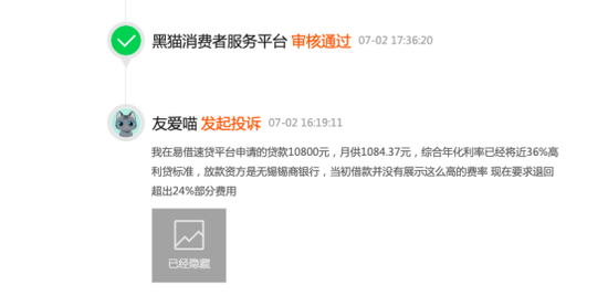 7月2日,有网友投诉表示,其在易借速贷申请借款10800元,月供1084.37元(推测分12期还款),综合年化利率接近36%,放款资方为无锡锡商银行,借款时并未展示这么高的费率,现在要求退回超过24%部分费用。