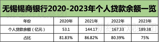2020-2023年,该行个人贷款余额分别达到53.1亿元、144.17亿元、167.33亿元和189.38亿元,占比分别达到81.83%、86.82%、80.39%和75%以上。
