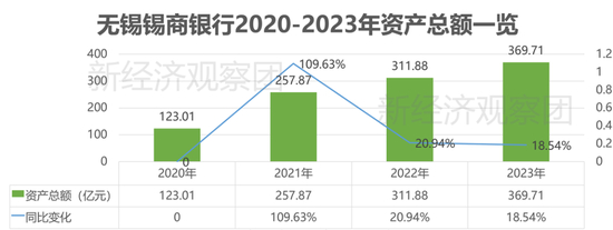 以不断增长的资产规模为例,2020-2023年,该行资产总额分别达到123.01亿元、257.87亿元、311.88亿元和369.71亿元,四年间增长超200%。