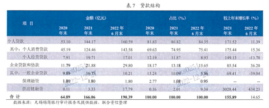 而在个人贷款当中,个人消费贷款又占了大头。联合资信的评级报告显示,2020-2022年6月末,锡商银行的个人消费贷款余额分别为45.19亿元、124.46亿元、143.58亿元,在总贷款中的比重分别为69.63%、74.95%、75.41%。