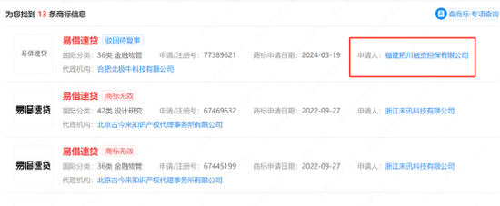 目前浙江未讯注册的“易借速贷”商标已显示无效,隶属于福建拓川融资担保有限公司(以下简称“拓川融资担保”)。拓川融资担保法定代表人为刘更顺,也在杭州霖梓物业管理有限公司担任法人,后者唯一股东为霖梓控股。