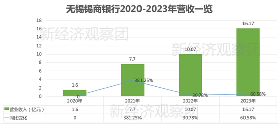 一方面,营收实现大幅增长。2020-2023年,该行分别实现营收1.6亿元、7.7亿元、10.07亿元和16.17亿元,四年间增长超910%。