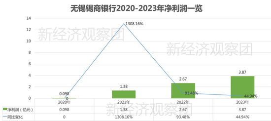 净利润表现同样如此。2020年,锡商银行的净利润仅为0.098亿元,但在2021年迅速增长至1.38亿元,同比增长了近14倍。在2022年,净利润上升至2.67亿元,同比增长93.48%。2023年,锡商银行实现净利润3.87亿元,较2022年仅增长了约45%。四年时间里,锡商银行净利润增长超39倍,但净利润增速已经明显回落。