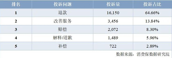 目前,消费保平台中,电影票相关的消费者诉求主要涉及退款、改善服务、赔偿、解释/道歉、补偿等;其中,要求退款的投诉高达16,150 件,占比64.66%;要求改善服务的次之,共接到相关投诉3,456 件,占比13.84%;要求赔偿排名第三,共接到相关投诉2,072 件,占比8.30%。