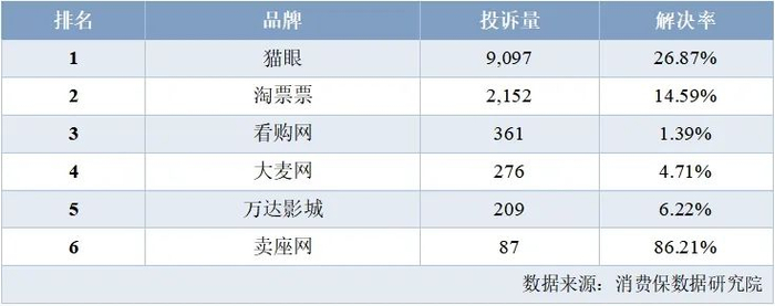 根据消费保受理的电影票相关投诉显示,入选投诉榜平台分别如下: