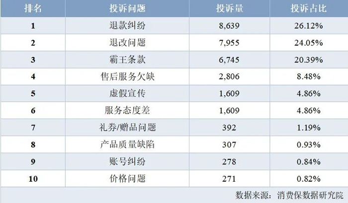 据消费保数据显示,电影票相关用户投诉问题类型主要包括退款纠纷问题(26.12%)、退改问题(24.05%)、霸王条款(20.39%)、售后服务欠缺(8.48%)、虚假宣传(4.86%),其余分别为服务态度差、礼券/赠品问题、产品质量缺陷、账号纠纷、价格问题等。
