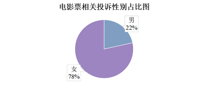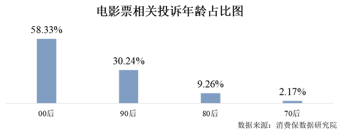 据消费保显示,电影票相关男性用户投诉比例为21.57%,女性用户投诉比例为78.43%;相关投诉用户年龄分布主要分布为:00后(58.33%)、90后(30.24%)、80后(9.26%)、70后(2.17%)。