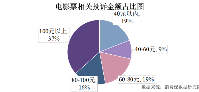 据消费保显示,电影票相关投诉金额分布主要分布为:40元以内(19.07%)、40-60元(9.41%)、60元-80元(18.61%)、80-100元(16.27%)、100元以上(36.64%)。
