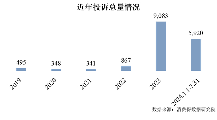 自2019年以来,中国电子商会旗下的消费服务保障平台消费保等收到17,054件电影票相关投诉。2019年以来,电影票相关投诉投诉量上升趋势明显,其中2023年投诉量为9,083件,同比增长超九倍,涉诉金额为366万;截止至2024年7月31日累计投诉量为5,920件。