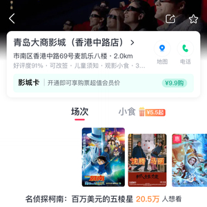 记者在青岛大商影城(香港中路店)看到,以正在上映的电影《名侦探柯南:百万美元的五棱星》为例,线上平台显示该影城8月16日、17日和18日三天都为特殊场,票价19.9元起,用影城卡购买则享受更低的价格,16.9元起。