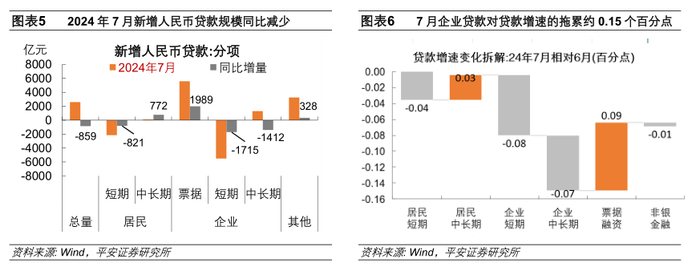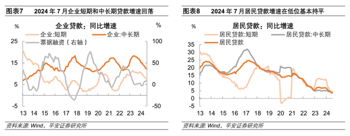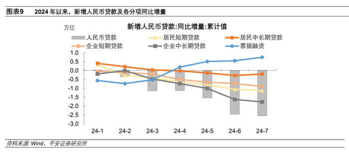 1)企业贷款同比缩量,对贷款增速的拖累增加0.15个百分点。其中,企业短期贷款单月净偿还5500亿元,企业中长期贷款新增1300亿元。当前看,制造业贷款实需有待巩固和提升,政策信贷支持力度边际回落(2024年7月,三家政策性银行PSL净归还925亿元),“挤水分”仍有一定影响。