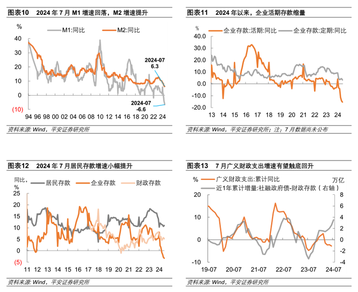 第一,“M1-M2增速差”继续下行,经济内生活力待巩固。2024年7月M1同比增速回落1.6个百分点至-6.6%,但M2同比增速提升0.1个百分点至6.3%,这使“M1-M2增速差”。“M1-M2增速差”是经济周期中的领先指标之一,因其既能够反映企业信贷扩张和利润改善情况(企业活期存款相对定期存款的变化),又能够反映居民消费和储蓄搬家情况(居民存款向企业活期存款转移),其领先PPI增速三到四个季度。2024年以来,企业活期存款同比较快收缩,而定期存款增速仍在3%以上;居民存款增速在10%以上的水平震荡,与企业存款增速的差距拉大、反映消费意愿不足,这两个现象集中体现在“M1-M2增速差”之中,可见经济内生活力待巩固,价格持续上行的支撑不足。