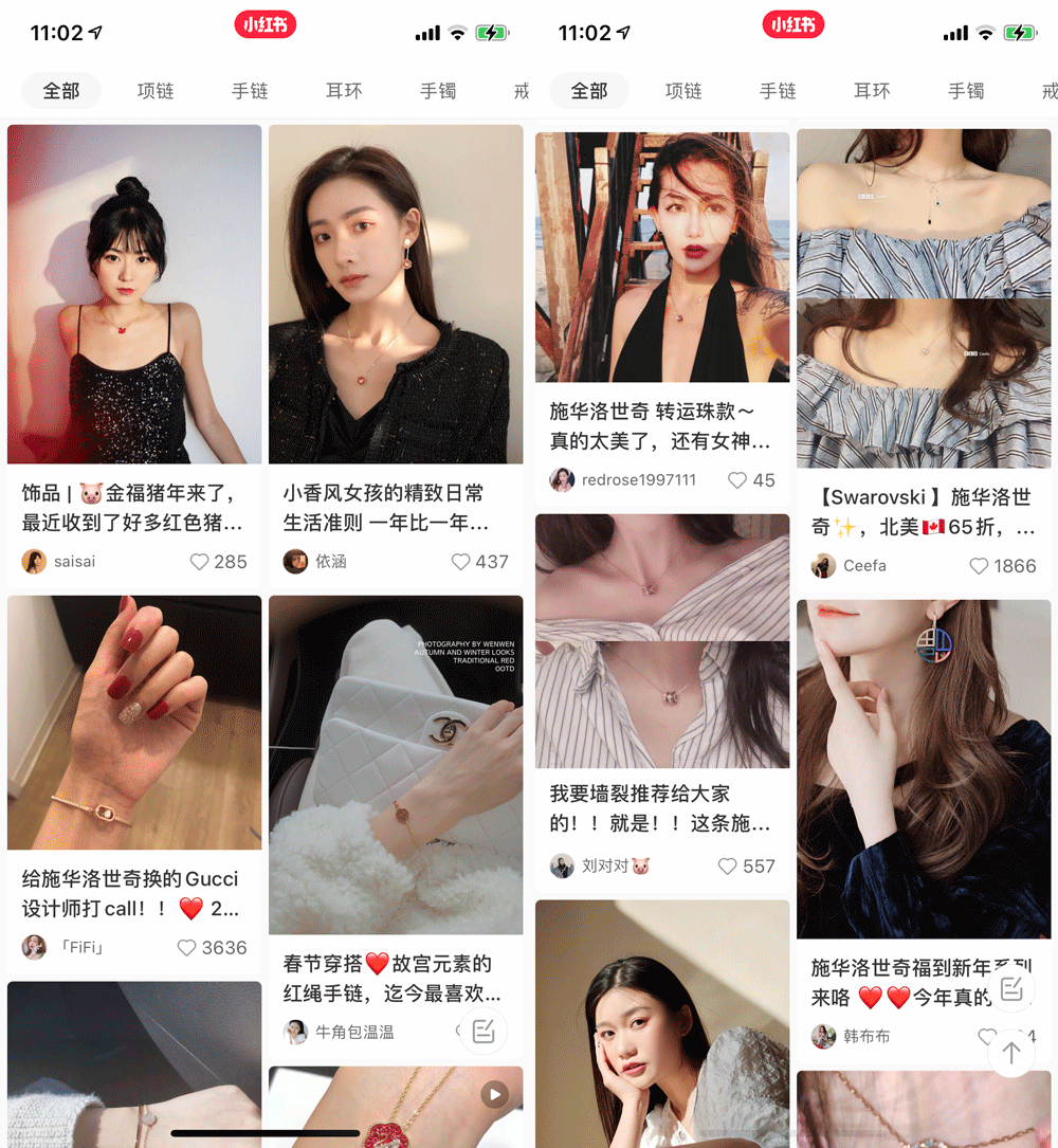 在小红薯上的种草笔记,施华洛世奇这个品牌拥有达到17W+的笔记,真·首饰界的顶流~