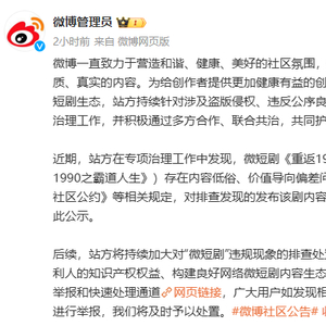 微博管理员称:近期,站方在专项治理工作中发现,微短剧《重返1990之首富人生》(《重返1990之霸道人生》)存在内容低俗、价值导向偏差问题,对此,站方依据《微博社区公约》等相关规定,对排查发现的发布该剧内容片段等违规内容予以清理,特此公示。