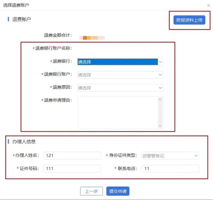 录入退款银行账户及办理人信息,同时,点击【附报资料上传】;