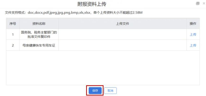 系统弹出上传附件弹窗,弹窗显示需要上传的资料名称,上传需要的附件,点击【保存】;