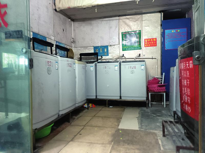 长堽村西路的出租房密集,有多家共享洗衣房分布其中。其中一家招牌快看不出字样的洗衣房里,放置着近10台洗衣机,运营模式与埌东村、建政南路等路段的共享洗衣房相似,所处环境都是比较简陋、老旧的民房。