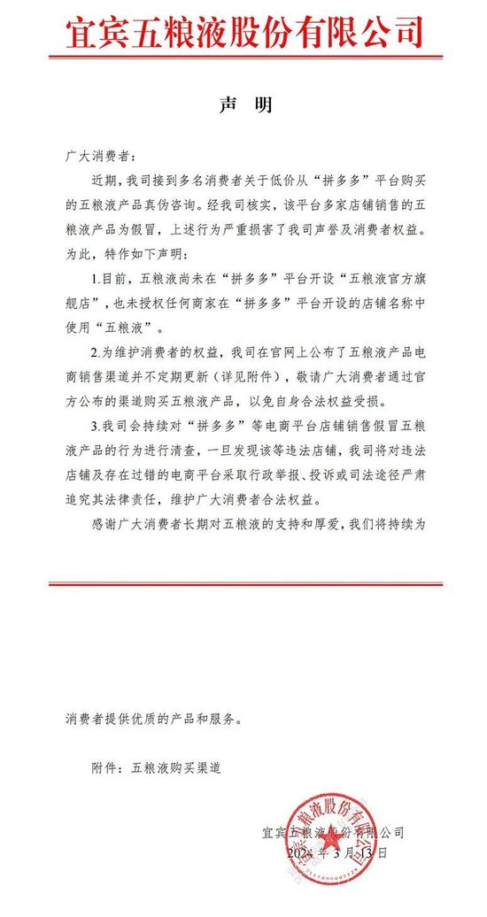 3月13日,五粮液称接到多名消费者关于低价从“某多多”平台购买的五粮液产品真伪咨询。经五粮液公司核实,该平台多家店铺销售的五粮液产品为假冒。当日晚间,五粮液官网发布声明。