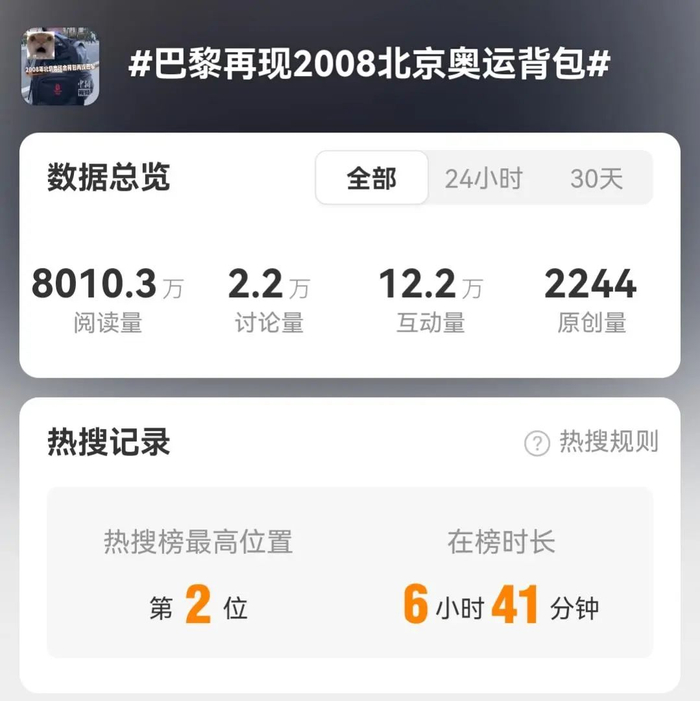 7月25日,#巴黎再现2008北京奥运会背包#登上微博热搜第2位,祥兴箱包的官方抖音账号则在7月26日快速开启直播带货,上架了13个商品,观看人次达到348万,销售额也达到了250万—500万元。