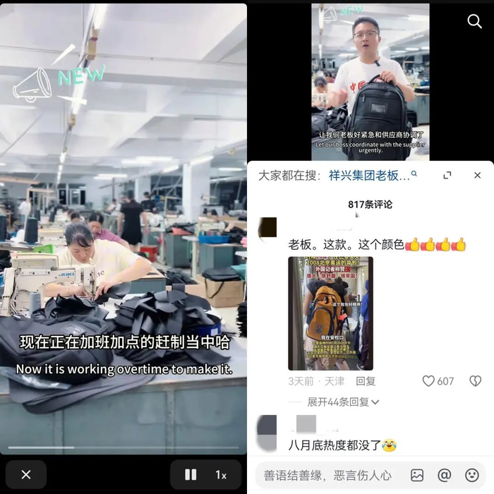 随后,奥运会的惊人流量开始具象化,背包不仅登上了微博热搜,还迎来了无数中国网友的“野性消费”。他们在各个电商平台搜索同款背包,背包背后的厂家“祥兴箱包”也承接住这波泼天的流量,快速响应热点开播卖货,边调侃“缝纫机都要踩冒烟了”,边喊话大学生来当“暑假工”……
